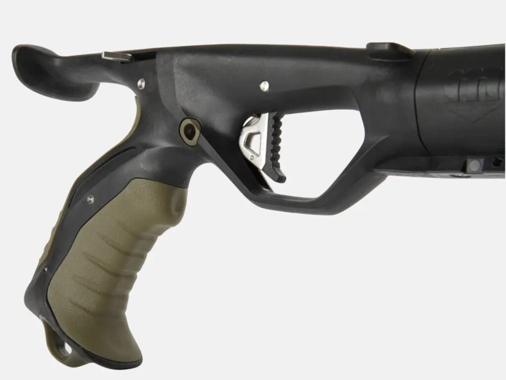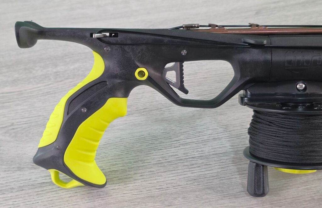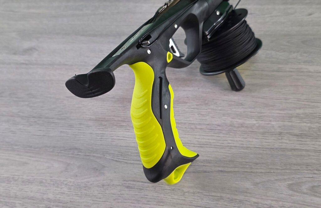Le grip est d’une réelle qualité. De bonnes dimensions et anatomique, elle est symétrique, ce qui signifie qu’elle peut être utilisée par les droitiers et les gauchers. Deux éléments, un à l’avant et un à l’arrière, de couleur jaune pour le Strike, le Strike Polygon (fût camouflage) et le Strike Element, pour une grande visibilité lorsque l’arbalète est laissée au fond de la mer, ou vert militaire pour le Strike Base.