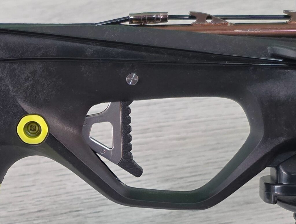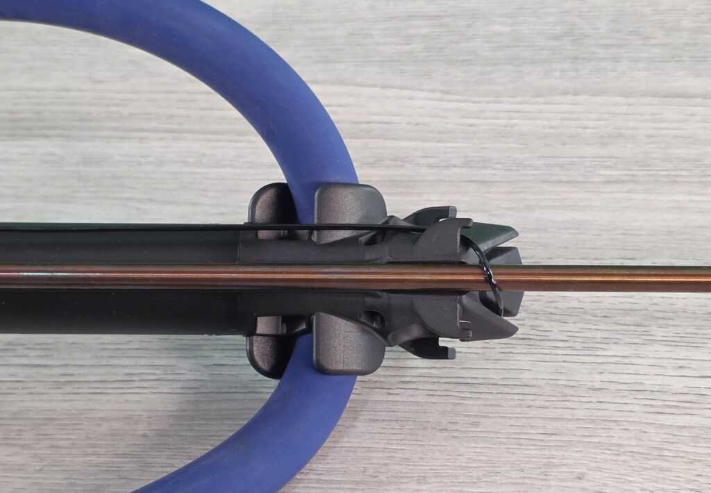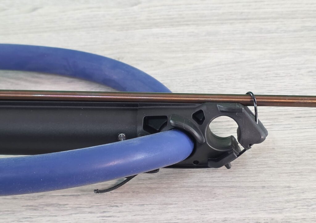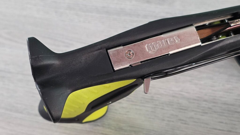 Le verrou de sécurité du Mares Strike est bien conçu. Il y a un bouton coulissant qui comporte à gauche un symbole de verrouillage. En appuyant sur le bouton du côté du verrou, le système bloque la détente. En appuyant sur le côté opposé, l’arbalète est libre de tirer. Lorsque le verrouillage est activé, les droitiers peuvent sentir le bouton avec la main, même s’il est petit et qu’avec des gants épais, il peut être plus difficile de le percevoir.