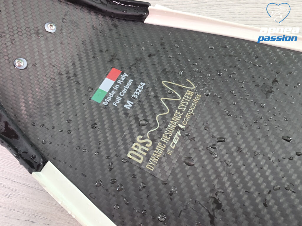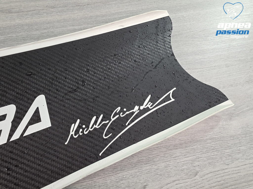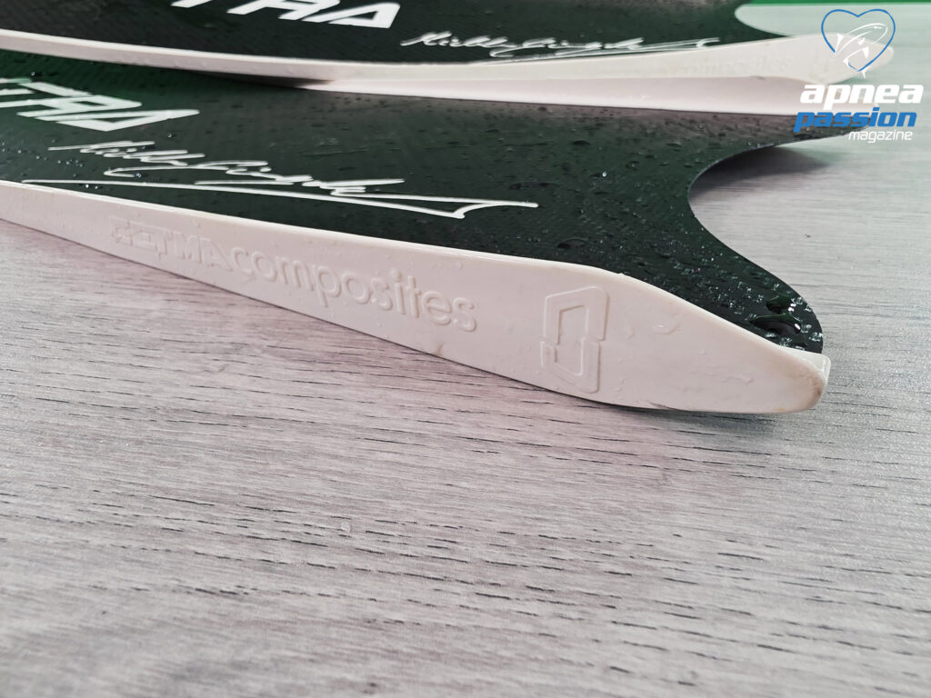 Les mesures d’Apneapassion indiquent un poids total du Cetma Mantra CWT de compétition, avec pochette 43-44, de 910 grammes. La voilure, très légère, a été mesurée à 295 grammes. La construction en 100% fibre de carbone IM7 rend cette voilure très légère, améliorant l’efficacité de la propulsion et réduisant la fatigue du plongeur.