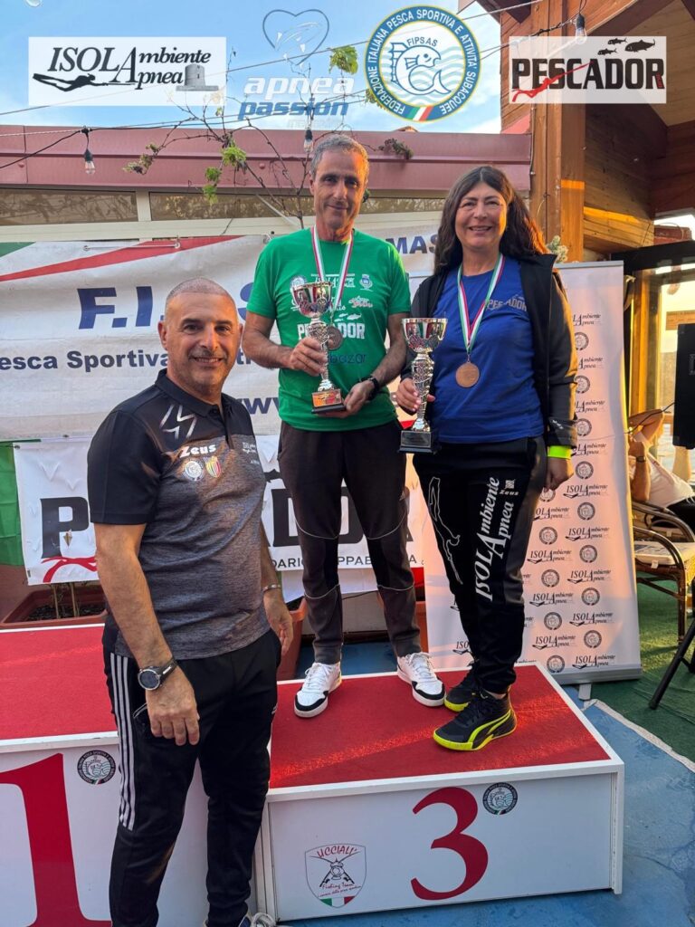 Terzo gradino del podio per Maria Fanito (Isola Ambiente Apnea) e Giuseppe Piccoli (Chico Sub Catanzaro), grazie a un’orata da circa 600 grammi.