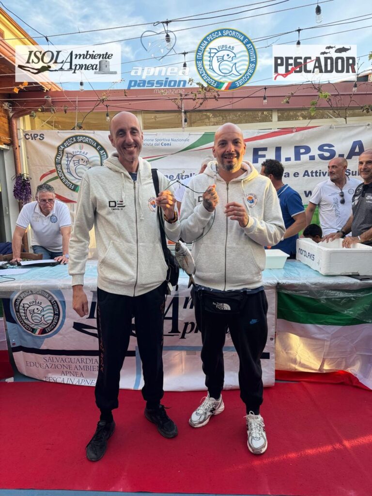 A imporsi su tutti, con una prestazione di carattere e lucidità tattica, la coppia Fabio Giaquinta – Giuseppe Mercurio, entrambi portacolori dell’ASD Isola Ambiente Apnea. Due orate valide e uno scorfano rosso – poi scartato per pochi grammi – sono bastati per portare a casa il titolo, grazie a una condotta di gara impeccabile in un mare davvero ostico.